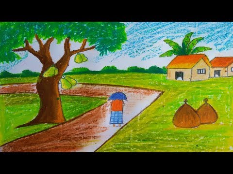 Drawing Scenery Village How To Draw Village Scenery With Oil Pastel